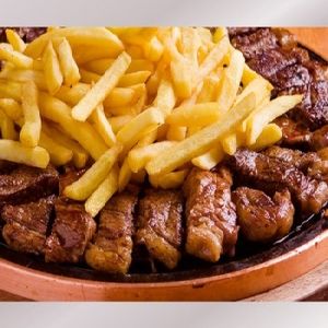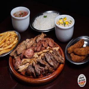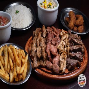 Picanha bovina,File de frango,Picanha suina,Linguiça Toscana (800 Gr de carne ao todo) Arroz Branco, Farofa de ovos ,Batata Frita,Molho a Campanha (para 2 até 3 pessoas)