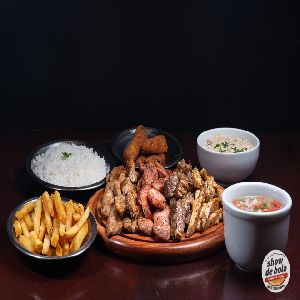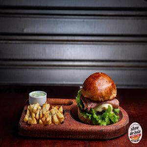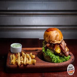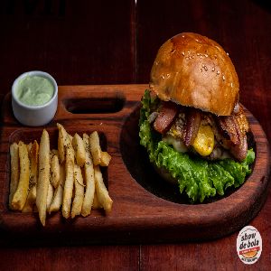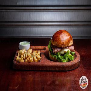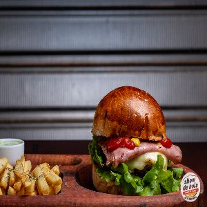 Pão de batata artesanal, 2 Blends bovinos show de bola (120 gramas), 2 fatias de mussarela, 2 fatias de presunto, 2 ovos fritos, tiras de bacon, salada e maionese gourmet especial (fritas inclusas)