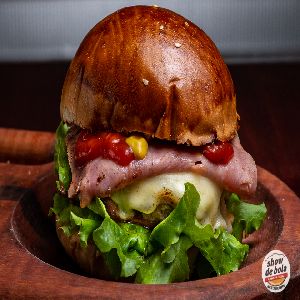 Pão de batata artesanal, Blend bovino show de bola (120gramas), 2 fatias de mussarela, 1fatia de presunto, 1 ovo frito, fatias de bacon, salada e maionese gourmet especial